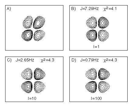 Figure 2. The Hb-Ha cross peak of ubiquitin Glu16 in the 800 MHz COSY spectrum. (A) experimental data, (B) best-fit simulated data using the correct intensity factor (I=1), and best fits when the intensity was constrained to be ten-fold (C) or 100-fold (D) larger. Note that the goodness of the fit (c2) is essentially the same for the three simulated spectra.
