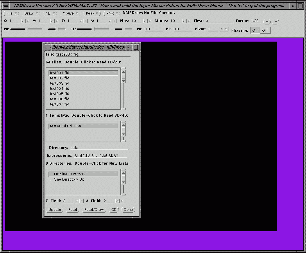 INSPECTING THE TIME DOMAIN DATA The converted, unprocessed, time domain NMR data can be read and inspected in NMRDraw to see whether it was acquired and converted successfully. Introduction to NMRDraw NMRDraw is a user‑oriented X11 graphical interface for inspecting and processing multidimensional NMR data. In its current implementation, NMRDraw may be used to prepare data for use with computer‑assisted analysis and assignment programs such as PIPP (Dan Garrett, NIH), ANSIG (Per Kraulis, Karolinska Institute), or NMRView (Bruce Johnson, One Moon Scientific). NMRDraw facilities include: