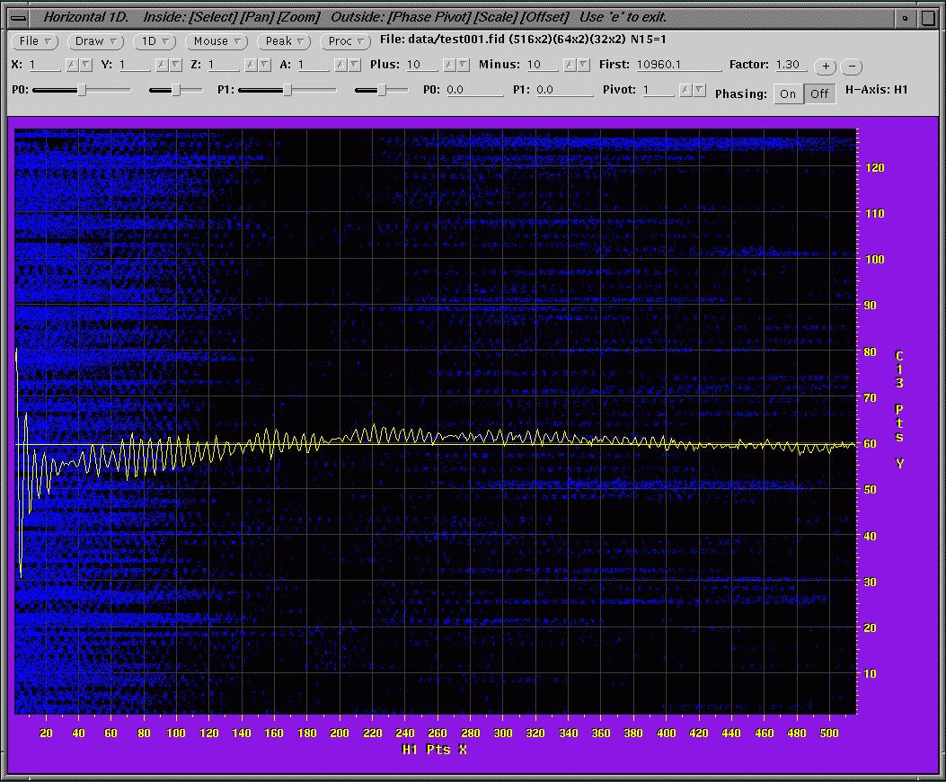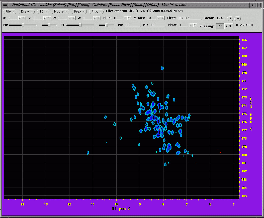 INSPECTING THE PROCESSED RESULT For easy phase correction of 3D spectra users should run the “proj3D.tcl” script that will create 2D projection planes of the 3D processed (frequency domain) dataset. The script uses the template “ft/test%03d.ft3” as default input (this can be changed as a command line option, give “proj3D.tcl –help” in a shell window for details). Phasing of each dimension of the processed 2D planes is done as described in detail previously. The steps are reminded below: Use File/Read to read a 2D plane into NMRDraw. The name of the data is specified by the Select File command in the File Menu; 1D and 2D data sets are selected according to their file names, 3D and 4D data are selected according to their template names. A 2D plot of the plane will be drawn automatically once the data is read: Adjust the threshold used in displaying the interferograms by mouse clicks on the +/‑ buttons of the Factor display parameter in the command panel. The other way to set an acceptable threshold level is by using the “Estimate Noise” command from the “Draw” or “Peak” menus or its “T” (Shift + t) keyboard shortcut. The height of the First contour displayed will change accordingly: To visualize a 1D slice use the “h” keyboard shortcut or, alternatively, by select “1D horizontal” from the “Mouse” menu: User can scale or move in real-time vertically (offset) the yellow 1D trace by middle or right mouse drag with the mouse pointer placed outside the graphical display area (i.e. on the purple border). Note: Don’t forget to enable phasing by clicking the “On” button from the “Phasing” command panel as the “Off” value is selected by default! The phase pivot can be set graphically by a left mouse click on the purple border (outside the graphical display area) just below the peak. An arrow will be displayed below the signal, on the purple border, to indicate the position of the phase pivot. The 1D slice can be phased by setting the phase pivot on an intense signal, adjusting the 0‑order phase correction (P0) slider and then adjusting the 1st order phase correction (P1) slider so that the rest of signals would be in phase with the peak at the pivot position: The same procedure is applied on the vertical axis (keyboard shortcut “v”) to complete the phasing of a 2D plane (or a 2D projection of a 3D dataset):
