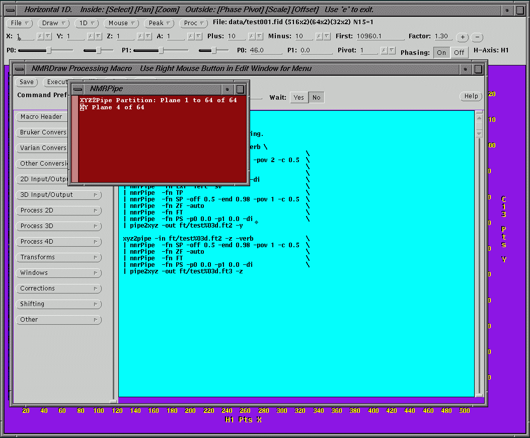 The data matrix is written out in the “ft” directory again as a template (test%03d.ft2) with only the 2 out of 3 dimensions processed (i.e. in frequency domain). The resulting planes can be inspected (commonly the first plane is of interest as it contains a sum of all signals as no evolution in the 3rd dimension has taken place). User can edit the script in this window (e.g. changing the 0 and 1st order phasing parameters): The phase correction can be adjusted in the first 2 dimensions (x and y axes) and reprocessed using the above fraction of the entire script by inserting an “exit 0” command after the first part of the script. Launching the execution of the processing script is done by clicking on the “Execute” button: Another window (red background) will pop-up and will show the processing progress: Subsequently the 3rd dimension (axis z) can be processed using only the 2nd part of the script (after removal of the “exit” command). The data matrix from the “ft” directory is loaded as a template (test%03d.ft2) and becomes input for the xyz2pipe function: